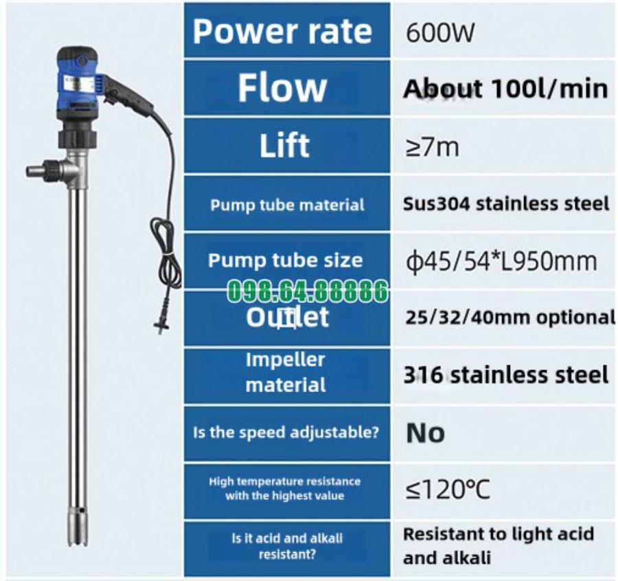 Bơm thùng phuy nhựa RPP JDT-G120-600W có ống hút bằng nhựa RPP, nhẹ và chịu hóa chất tốt, dễ đưa vào IBC tank: