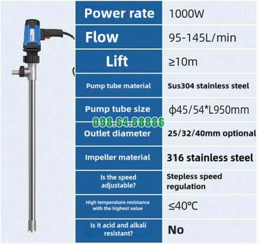 Bơm cắm điện thùng phuy JDT-1000W-304SUS được thiết kế để đạt sự cân bằng phù hợp giữa áp suất và lưu lượng, đảm bảo hiệu quả bơm trong phạm vi làm việc của thùng phuy.