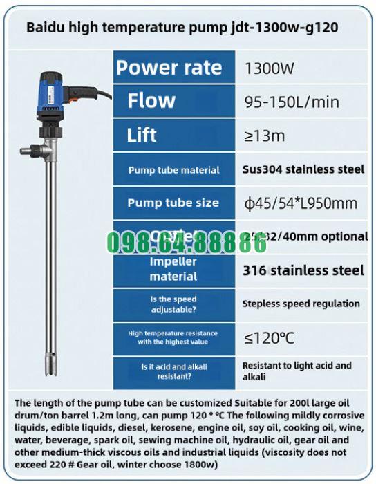 Độ ồn thấp là một ưu điểm lớn của bơm thùng phuy nhiệt độ cao JDT-1300W-G120