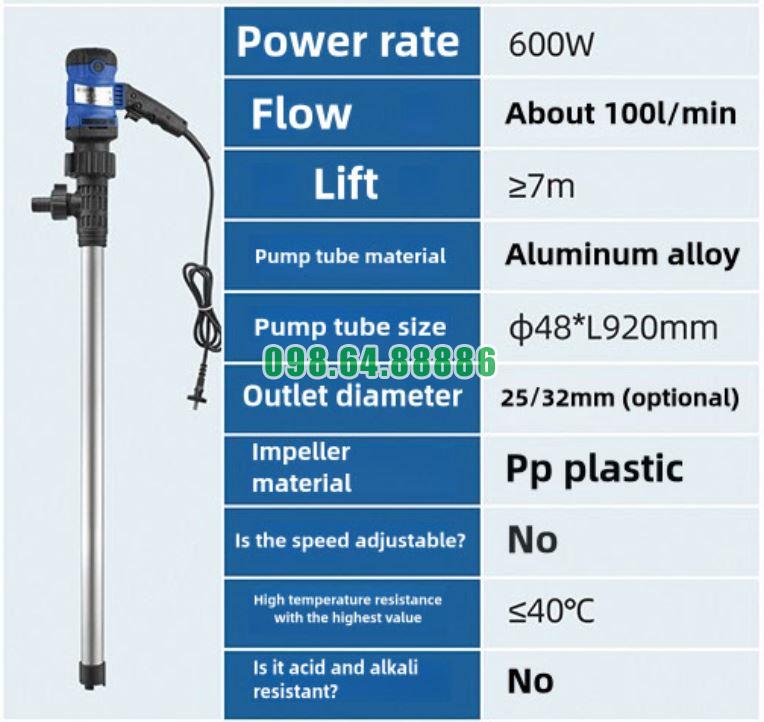 Máy bơm thùng phuy điện model JDT-L92-600W có khả năng chống ăn mòn hóa chất vượt trội nhờ sử dụng vật liệu chuyên dụng như inox 316, RPP hoặc PVDF kết hợp với gioăng chịu hóa chất cao cấp. Thiết kế cánh bơm, trục bơm và buồng bơm tối ưu giúp máy hoạt động bền bỉ, an toàn và ổn định trong môi trường hóa chất khắc nghiệt. Đây là một trong những ưu điểm quan trọng khiến model này được sử dụng rộng rãi trong công nghiệp hóa chất, xi mạ, sơn – mực in và xử lý dung môi.