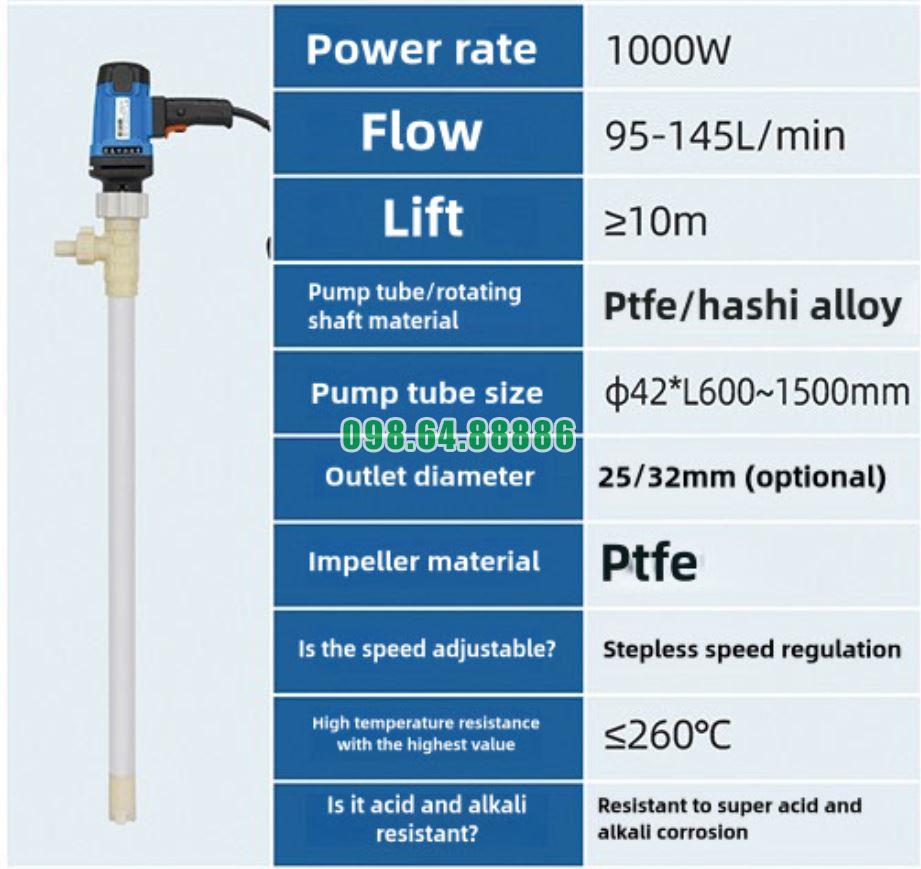 Bơm điện nhúng thùng phuy hóa chất chống ăn mòn model JDT-1000W-PTFE được thiết kế để làm việc với nhiều loại chất lỏng khác nhau, đặc biệt là các hóa chất nguy hiểm, độc hại và có tính ăn mòn cao. Nhờ sử dụng vật liệu PTFE và cấu trúc tối ưu, bơm có thể xử lý hiệu quả axit, bazơ và các dung môi công nghiệp mà vẫn đảm bảo độ an toàn và ổn định.