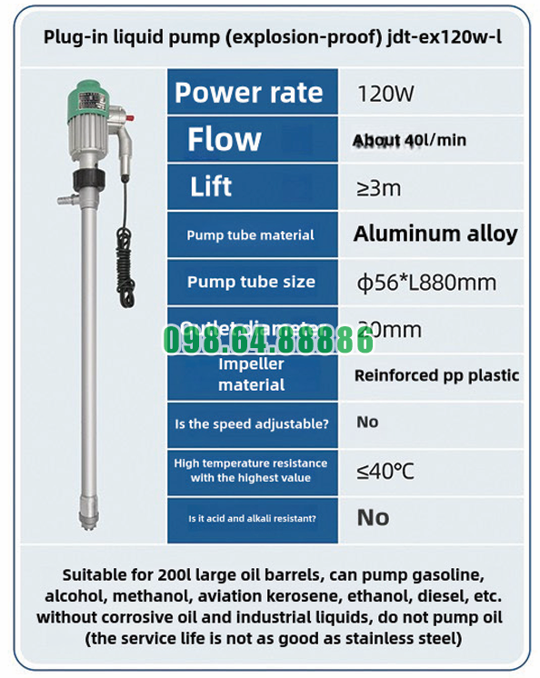 Trong môi trường làm việc với các dung môi dễ cháy như xăng, ethanol hay methanol, thiết bị sử dụng phải đáp ứng những tiêu chuẩn an toàn và hiệu suất nghiêm ngặt. Máy bơm chất lỏng cầm tay chống cháy nổ JDT-EX120W-L được thiết kế để đáp ứng các yêu cầu khắt khe này, mang lại sự tin cậy cao trong quá trình vận hành.