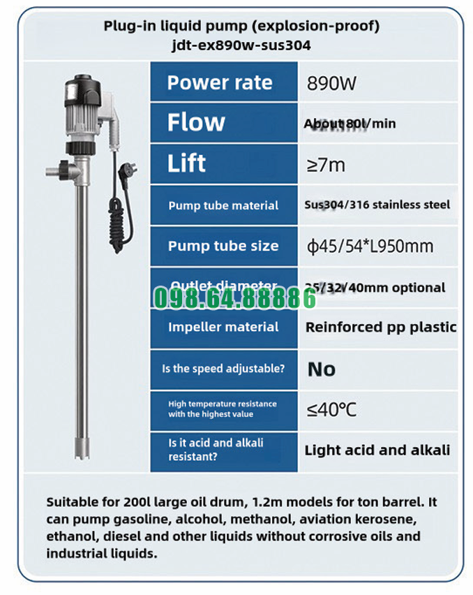 Máy bơm chất lỏng cắm trực tiếp chống cháy nổ JDT-EX890W-SUS304 được trang bị động cơ kín, hạn chế tối đa tia lửa điện và nguy cơ cháy nổ khi làm việc với dung môi dễ cháy.