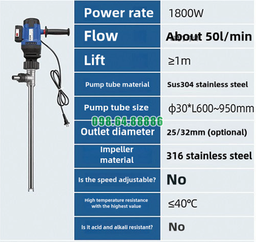Inox 304 là vật liệu trung tính, không phản ứng với dầu động cơ, dầu thủy lực và các chất lỏng công nghiệp thông dụng. Nhờ đó, Máy bơm hút dầu thùng phuy JDT-1800W-30SUS304 đảm bảo không làm biến đổi tính chất của chất lỏng, đồng thời hạn chế nguy cơ nhiễm tạp chất kim loại.