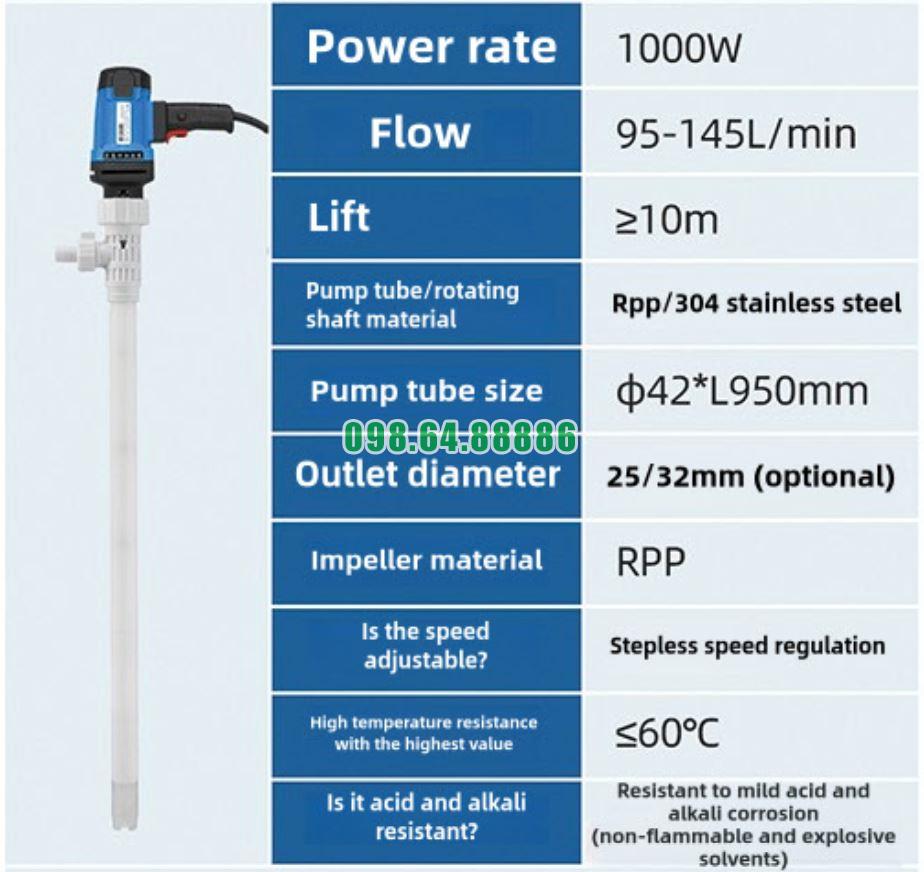 Trong ngành thực phẩm, an toàn và vệ sinh là yêu cầu bắt buộc trong mọi khâu sản xuất, chế biến và lưu trữ. Các thiết bị tiếp xúc trực tiếp với nguyên liệu lỏng cần đảm bảo không thôi nhiễm, không phản ứng hóa học và dễ vệ sinh. Bơm cắm điện thùng phuy model JDT-1000W-PVDF là giải pháp hỗ trợ hiệu quả cho doanh nghiệp thực phẩm trong quá trình bơm và chiết rót nguyên liệu.