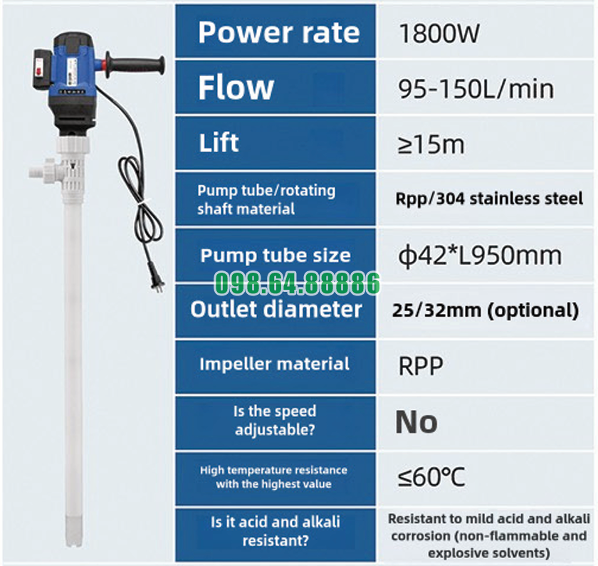 Nhờ sự kết hợp giữa động cơ 1800W, trục bơm inox 304 và cánh bơm RPP, Máy bơm chất lỏng điện cắm điện JDT-1800W-RPP có thể tạo ra lực ly tâm mạnh mẽ để vận chuyển nhiều loại chất lỏng công nghiệp.