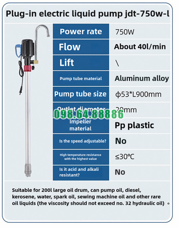 - Trục dài 900mm (chiều dài ống bơm), giúp dễ dàng tiếp cận các thùng phuy 200L và đảm bảo khả năng hút và đẩy chất lỏng hiệu quả.