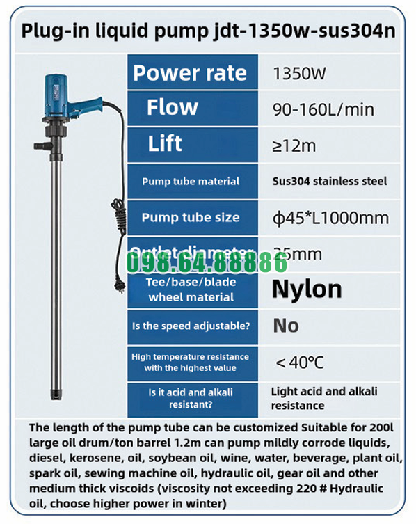 Máy Bơm Hút Thùng Phuy Cắm Điện JDT-1350W-SUS304N Xử Lý Tốt Các Dung Dịch Có Tính Kiềm Thấp